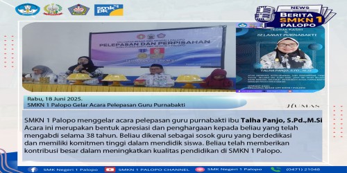 Rabu, 18 Juni 2025. SMKN 1 Palopo menggelar acara pelepasan guru purnabakti, Ibu Talha Panjo, S.Pd., M.Si. Acara ini merupakan bentuk apresiasi dan pe..