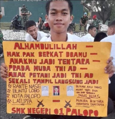 PALOPO, 17 Juli 2025 – Sebuah kisah inspiratif datang dari salah satu alumni SMK Negeri 1 Palopo. Dari Rante Nase, Buntu Lobo, Kota Palopo, yang merupakan lulusan jurusan kuliner, kini sukses meniti karier sebagai Prajurit Muda TNI Angkatan Darat. Kabar gembira ini tersebar luas setelah sebuah foto yang menunjukkan pemuda tersebut memegang poster ucapan syukur menjadi viral.
